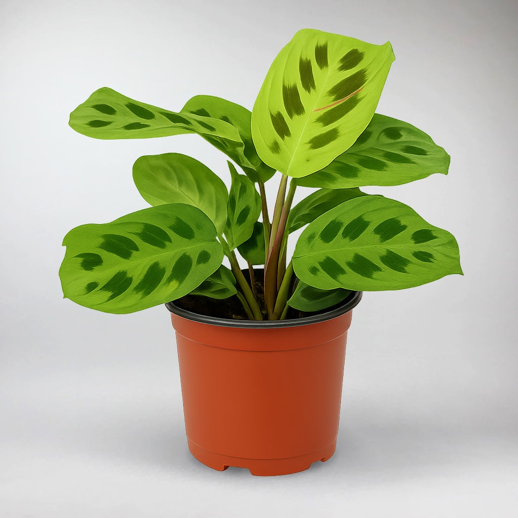 The Beauty Kim thrives in bright, indirect light. Best on windows filtered through sheer curtains. In lower light, variegation will soften and growth will expectedly slow, but the plant remains healthy. Avoid putting the Maranta Leuconeura Variegata in direct midday sun, which can scorch the delicate patches it has. It also performs well in shaded, covered balconies or bright interior spots, making it an adaptable choice for homeowners and renters alike.