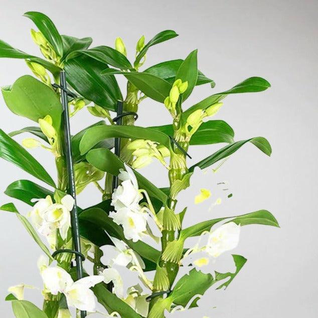 Transform any space with the serene beauty of the Bamboo Orchid 'Apollon', a rare and enchanting variety of Dendrobium known for its tall, bamboo-like stalks and brilliant white flowers. Each plant features 2 to 4 flower clusters per stalk, resembling a sculptural bouquet in full bloom.