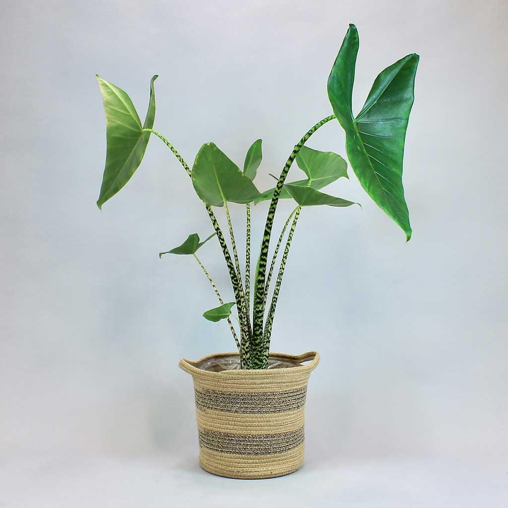 Behold one of nature's great quirks. This Alocasia boasts sturdy animal-print rhizomatic stems (multiple stems branching off from a single base) and broad arrow-shaped Elephant Ear leaves.