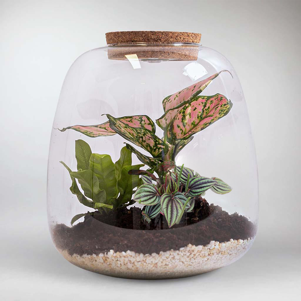 The glass jar is made of 100% recycled glass. You’ll also receive a cork lid, gravel, charcoal and soil to create the perfect mini jungle.