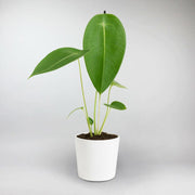 Anthurium peltigerum is an uncommon species with elongated, shield‑like leaves and a bold, sculptural presence. Its foliage matures to deep green with subtle veining, creating a refined tropical look. Keep it warm with higher humidity and bright, indirect light. Water once the top few centimetres dry and use a loose, bark‑rich mix.